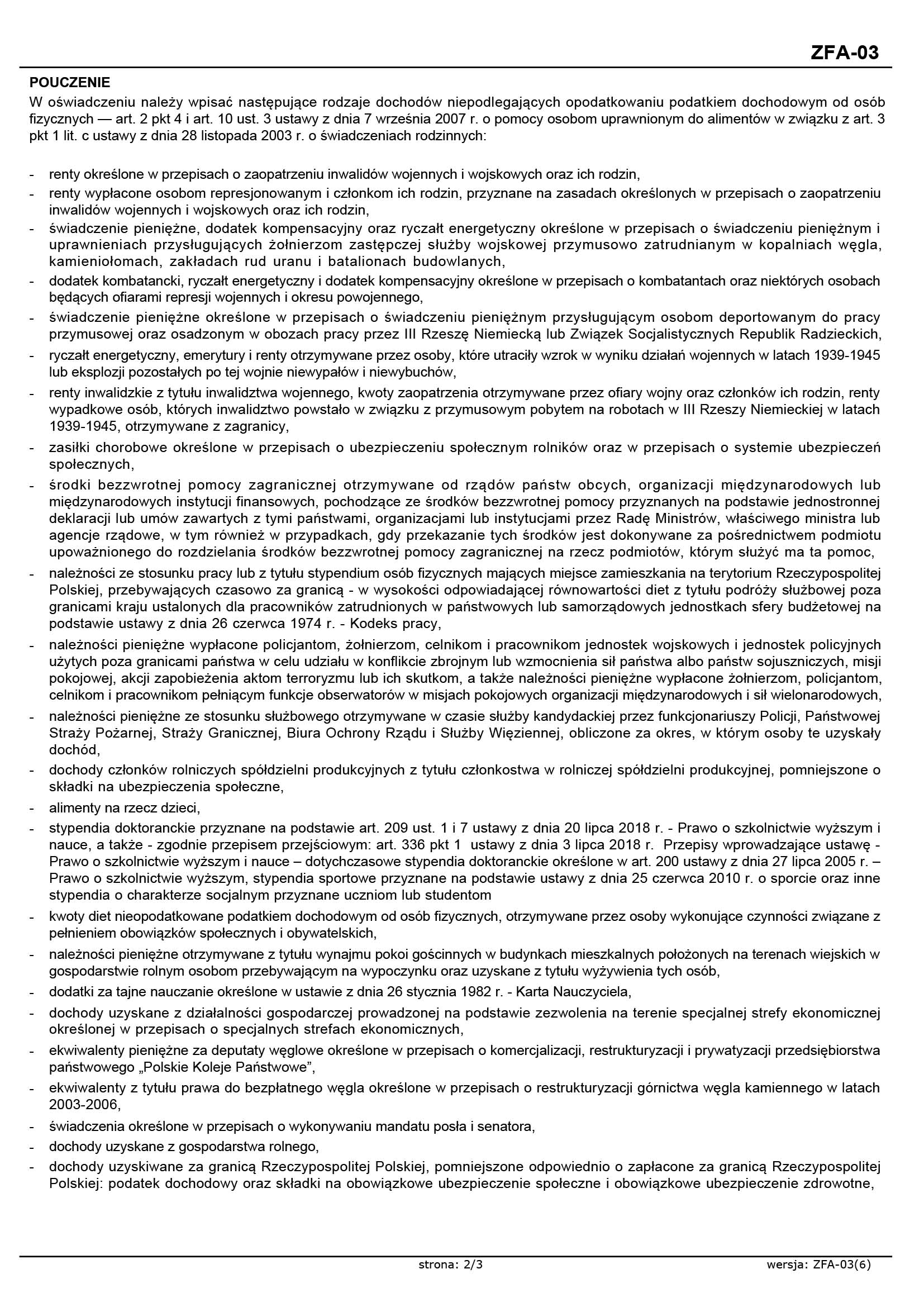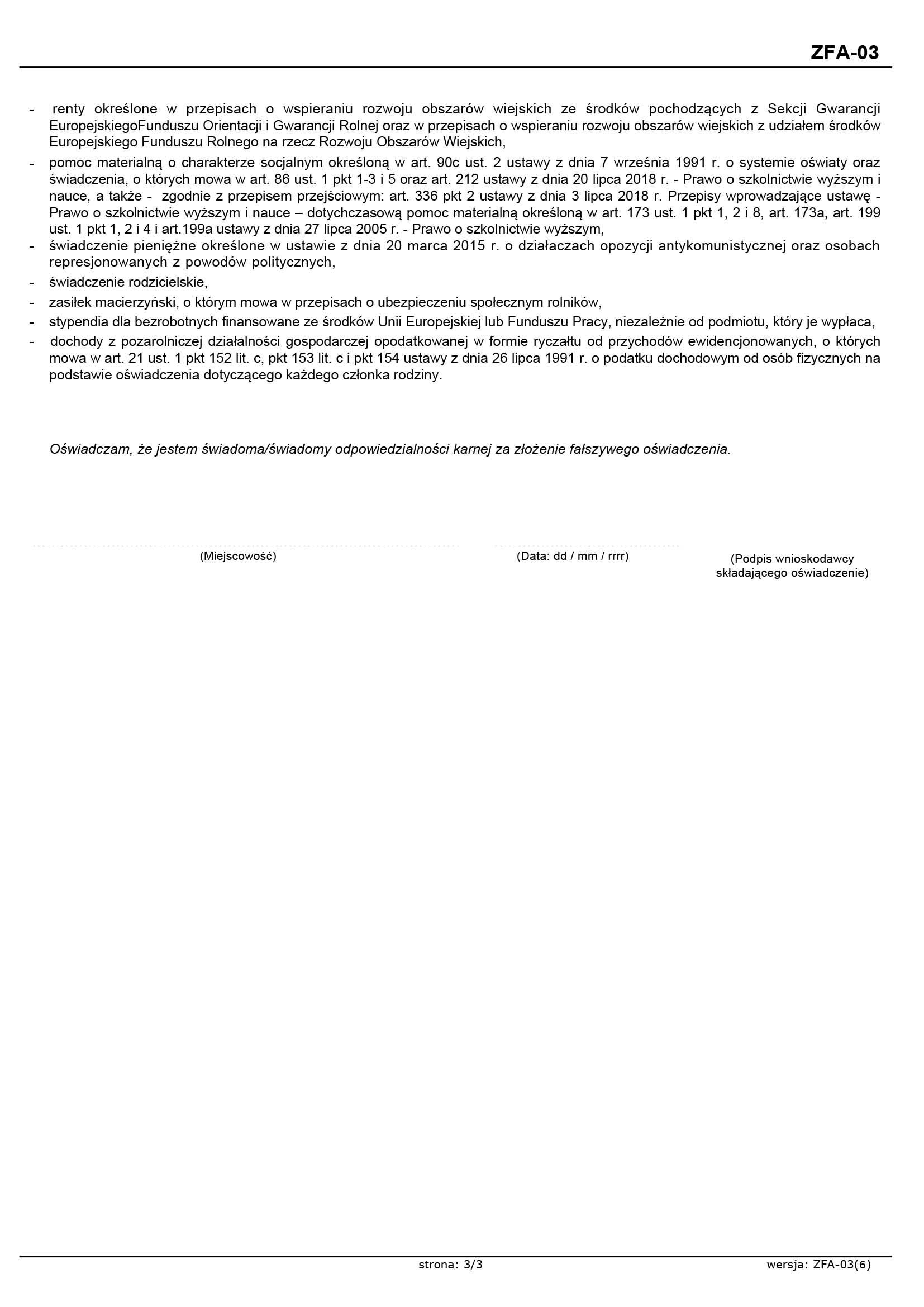 OŚWIADCZENIE WNIOSKODAWCY O DOCHODACH SWOICH ALBO CZŁONKA RODZINY OSIĄGNIĘTYCH W ROKU KALENDARZOWYM POPRZEDZAJĄCYM OKRES ŚWIADCZENIOWY INNYCH NIŻ DOCHODY PODLEGAJĄCE OPODATKOWANIU NA ZASADACH OKREŚLONYCH W ART. 27, ART. 30B, ART. 30C, ART. 30E I ART. 30F USTAWY Z DNIA 26 LIPCA 1991 R. O PODATKU DOCHODOWYM OD OSÓB FIZYCZNYCH ZFA-03