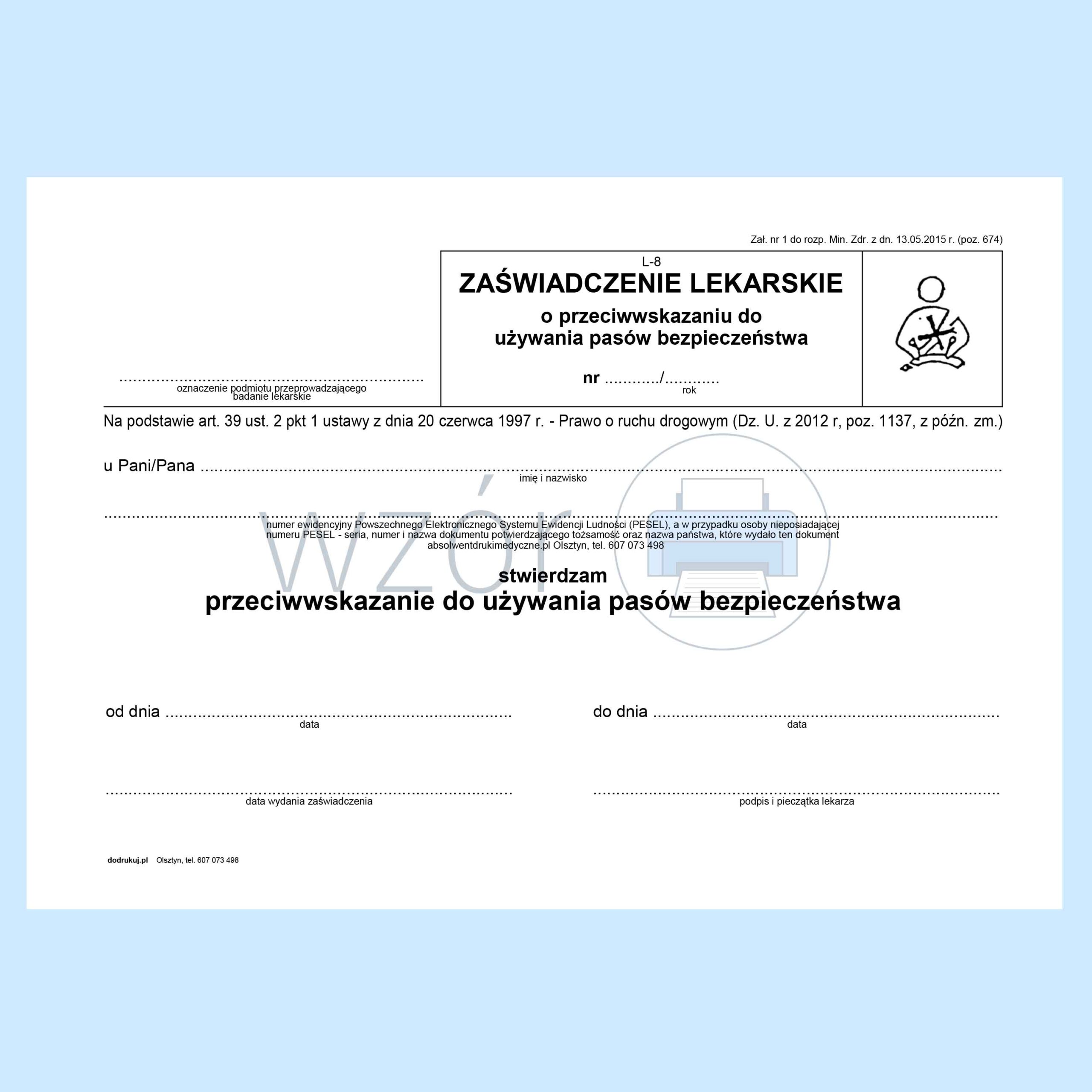 L-8 Zaświadczenie lekarskie o przeciwwskazaniach do używania pasów bezpieczeństwa A5a/bl.100k