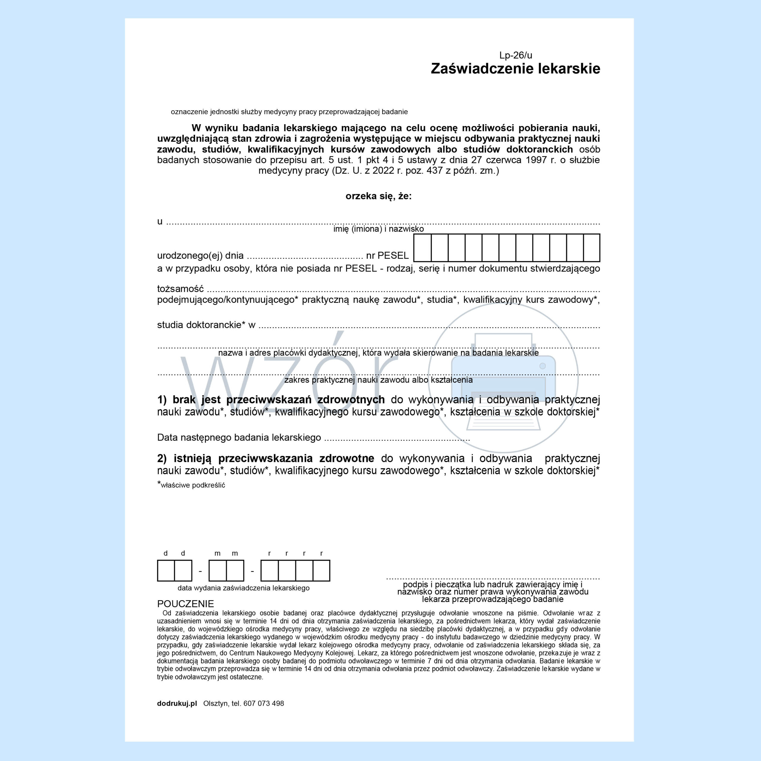 LP-26/U Zaświadczenie lekarskie (uczeń/student).
