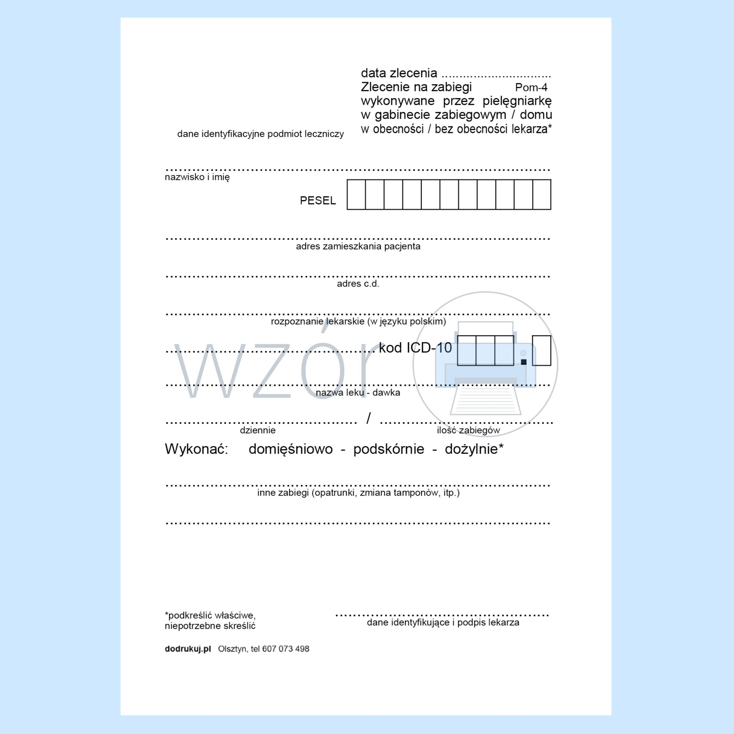 Pom-4 Zlecenie na zabiegi wykonywane przez pielęgniarkę w gabinecie zabiegowym / domu.
